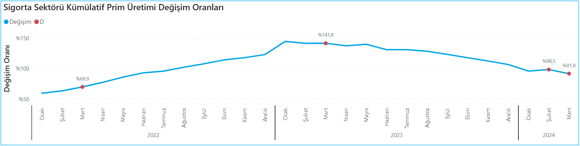 TSB sigorta sektörü verilerine göre; sektör 2024 yılının ilk üç ayında önceki yılın aynı dönemine göre prim üretiminde yüzde 91,8 oranında artış göstererek 199.26 Milyar TL hacme ulaştı. Bu oran 2023 yılının aynı döneminde yüzde 141,8 olarak gerçekleşmişti.