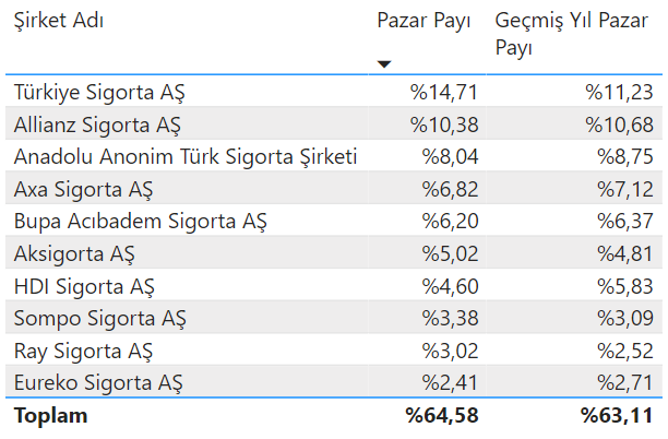 TSB sigorta sektörü verilerine göre; şirket sıralamasında Türkiye Sigorta A.Ş yüzde 14,71’lik Pazar payı ile sektörü domine etmeye devam ediyor. Sıralamada Allianz Sigorta A.Ş yüzde 10,38 ile ikinci sırada yer alırken, Anadolu Anonim Türk Sigorta Şirketi yüzde 8,04 ile üçüncü sırada yerini aldı.