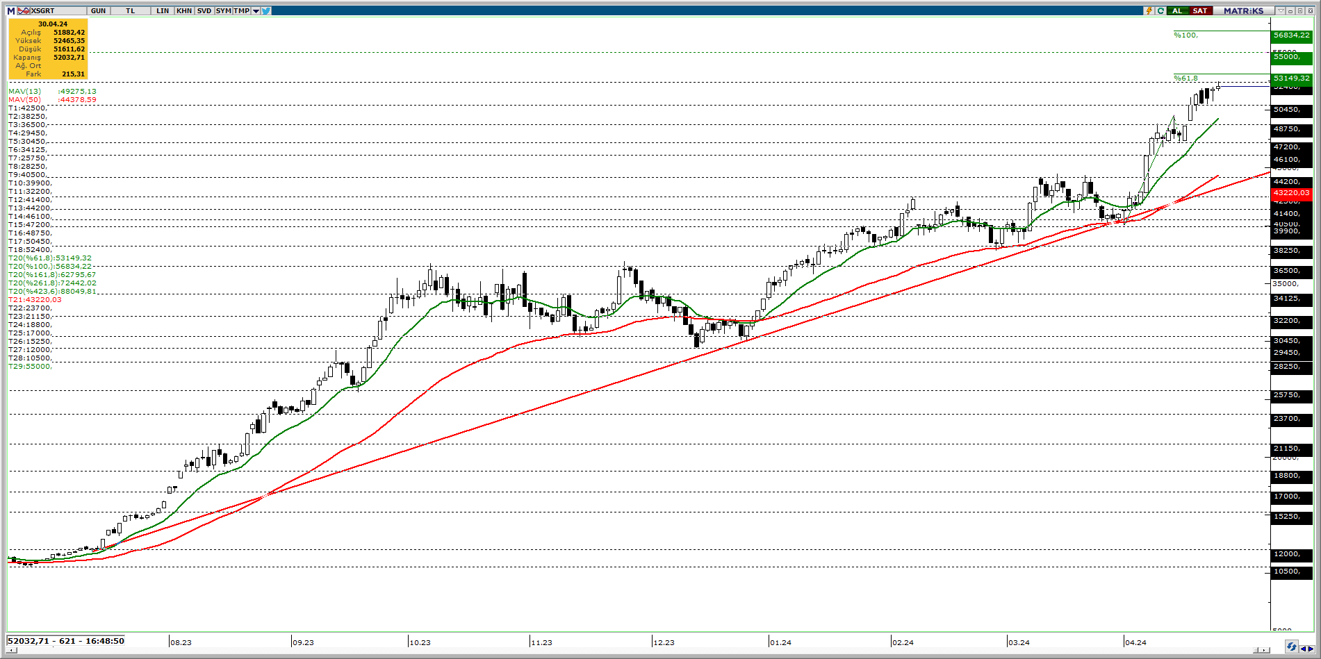 2023 Temmuz ayından bu yana istikrarlı yükseliş ivmesinde olan Sigorta endeksi, son birkaç gündür 52400 seviyesinden baskı görse de, yükselen trend çizgisi ve referans göstergeler olarak takip ettiğimiz 13 ve 50 günlük üssel hareketli ortalamalar üstünde pozitif ivmelenmeye devam ediyor. Endekste mevcut durumda yükselişin devam etmesi ve 52400 seviyesinin aşılması durumunda, Fibonacci Expansion 53149, 50000 ve 56834 seviyelerine doğru yükseliş gerçekleşebilir. Aksi takdirde endekste olası geri çekilmelerin gerçekleşmesi durumunda ise 50450, 48750 ve 47200 seviyelirine doğru düşüş gözlenebilir.