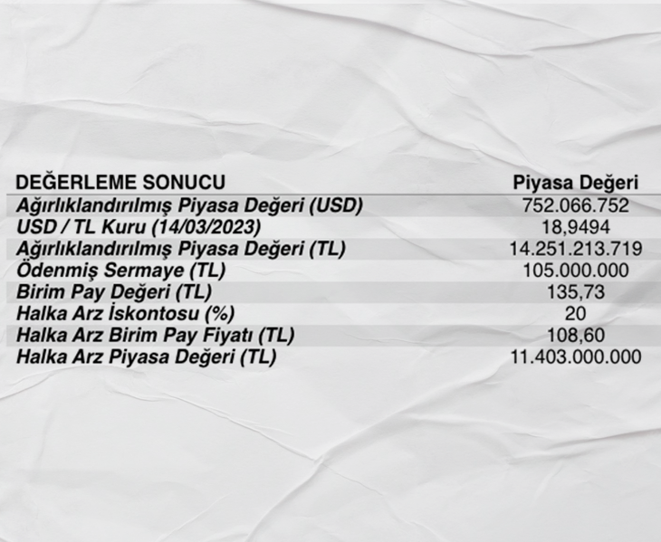 Elde edilen değere %20 oranında halka arz iskontosu uygulanmıştır ve halka arz fiyatı pay başına fiyatı 108,60 TL olarak belirlenmiştir.