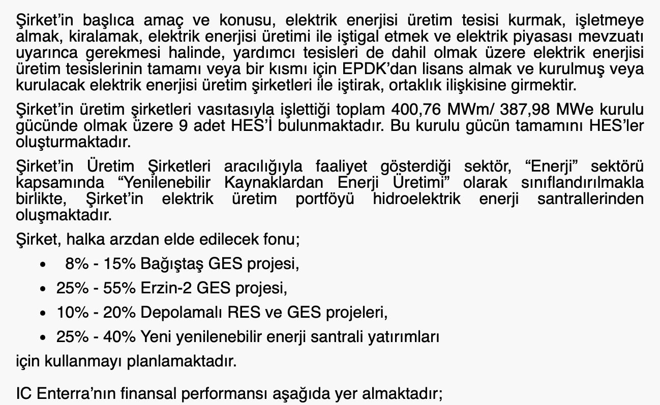 • Faaliyet Alanı: Şirket’in başlıca amaç ve konusu, elektrik enerjisi üretim tesisi kurmak, işletmeye almak, kiralamak, elektrik enerjisi üretimi ile iştigal etmek ve elektrik piyasası mevzuatı uyarınca gerekmesi halinde, yardımcı tesisleri de dahil olmak üzere elektrik enerjisi üretim tesislerinin tamamı veya bir kısmı için EPDK’dan lisans almak ve kurulmuş veya kurulacak elektrik enerjisi üretim şirketleri ile iştirak, ortaklık ilişkisine girmektir.