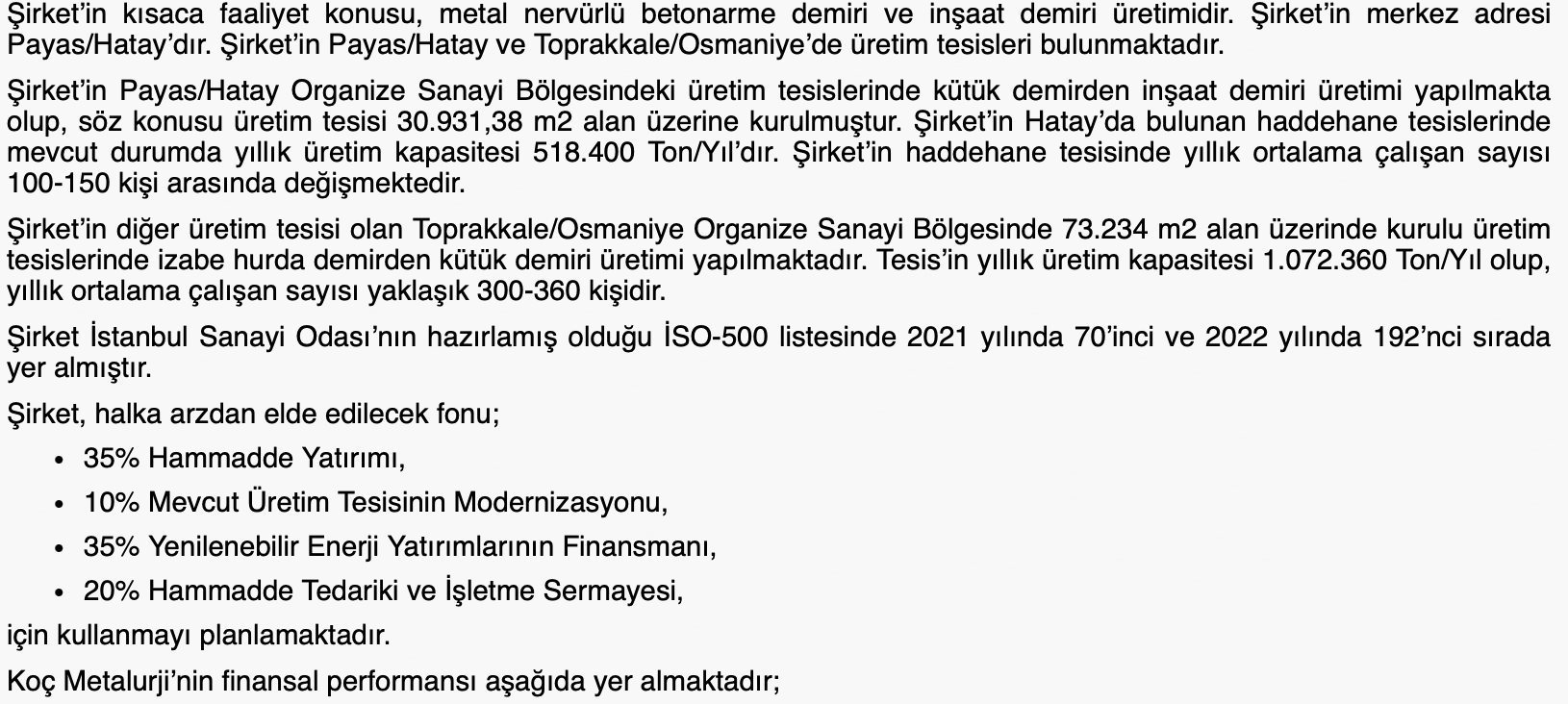 • Faaliyet Alanı: Şirket’in kısaca faaliyet konusu, metal nervürlü betonarme demiri ve inşaat demiri üretimidir.