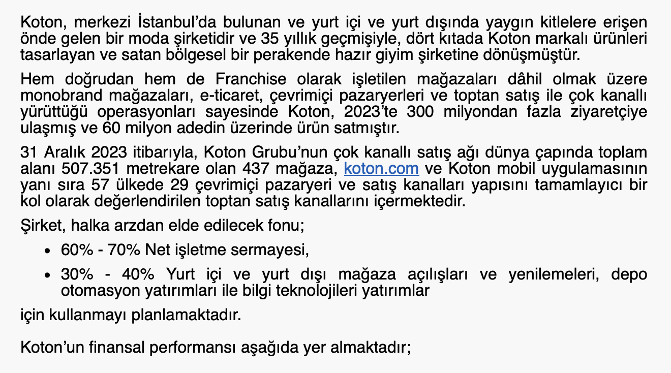 • Faaliyet Alanı: Koton, merkezi İstanbul’da bulunan ve yurt içi ve yurt dışında yaygın kitlelere erişen önde gelen bir moda şirketidir ve 35 yıllık geçmişiyle, dört kıtada Koton markalı ürünleri tasarlayan ve satan bölgesel bir perakende hazır giyim şirketine dönüşmüştür.