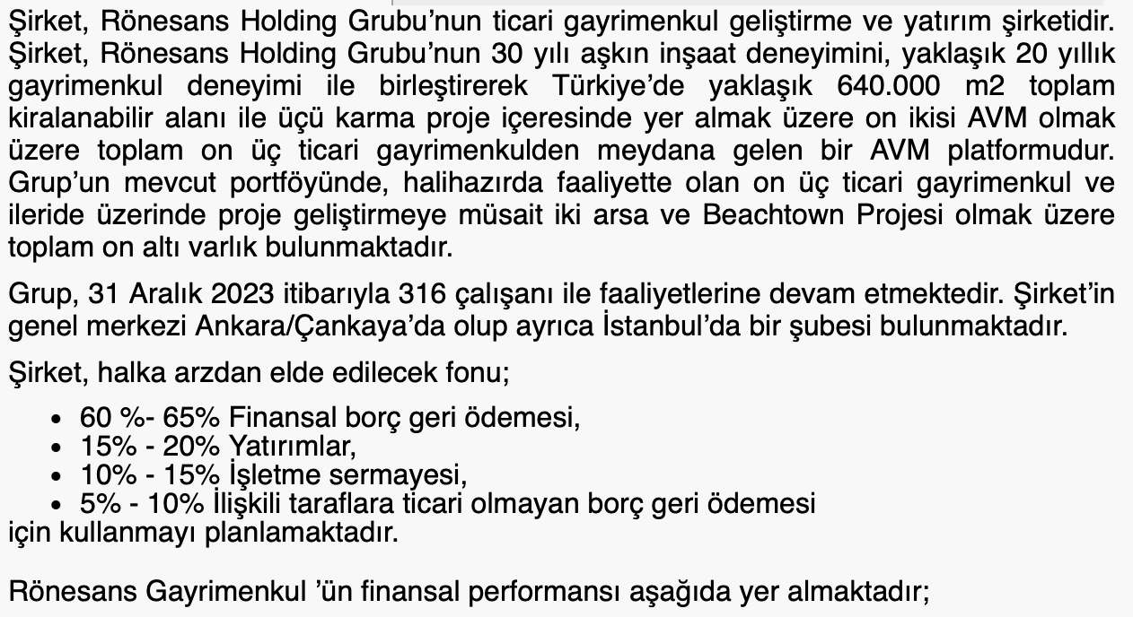 • Faaliyet Alanı: Şirket, Rönesans Holding Grubu’nun ticari gayrimenkul geliştirme ve yatırım şirketidir. Şirket, Rönesans Holding Grubu’nun 30 yılı aşkın inşaat deneyimini, yaklaşık 20 yıllık gayrimenkul deneyimi ile birleştirerek Türkiye’de yaklaşık 640.000 m2 toplam kiralanabilir alanı ile üçü karma proje içeresinde yer almak üzere on ikisi AVM olmak üzere toplam on üç ticari gayrimenkulden meydana gelen bir AVM platformudur