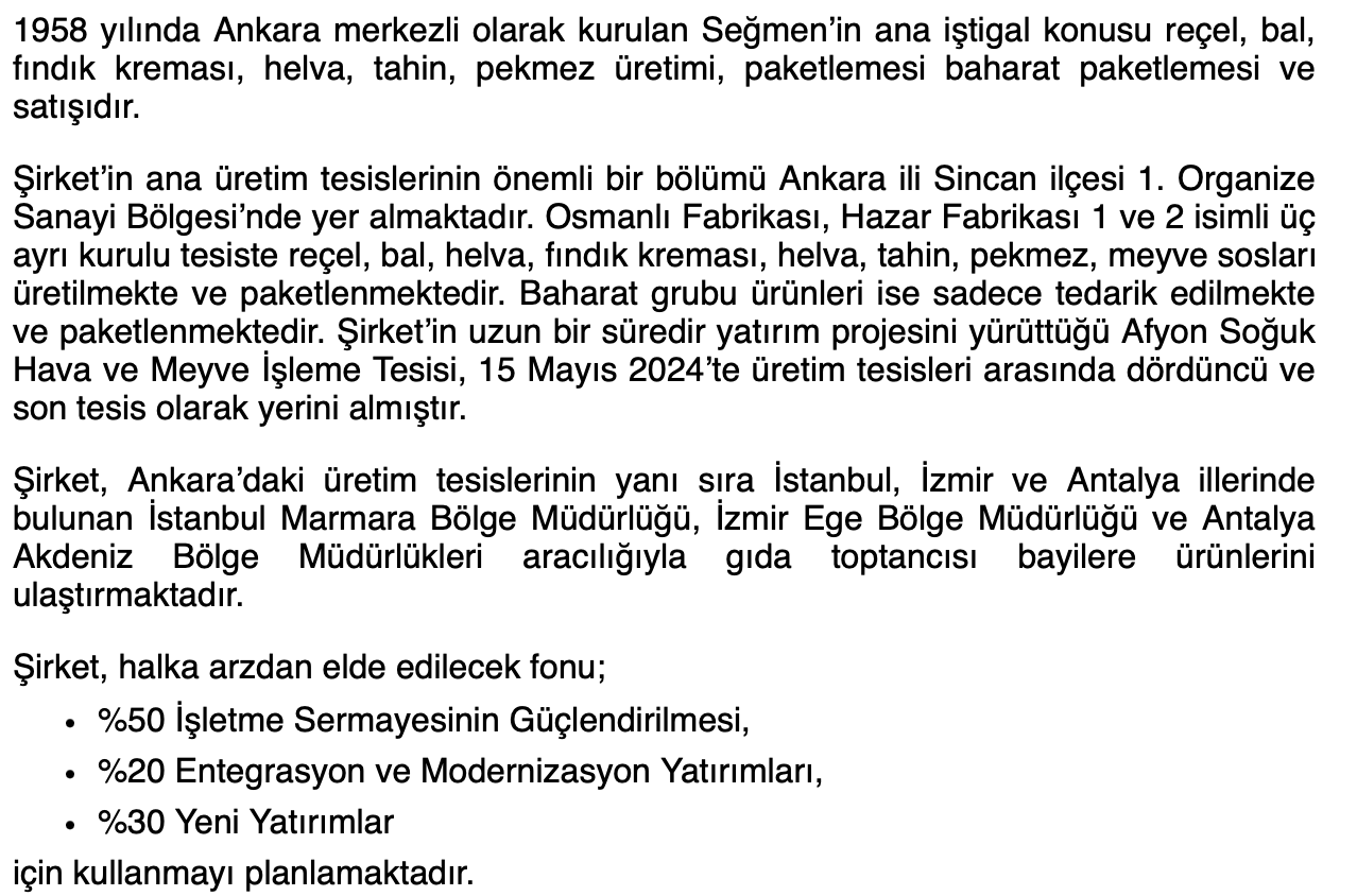• Faaliyet Alanı: 1958 yılında Ankara merkezli olarak kurulan Seğmen’in ana faaliyet alanı reçel, bal, fındık kreması, helva, tahin, pekmez üretimi, paketlemesi baharat paketlemesi ve satışıdır.